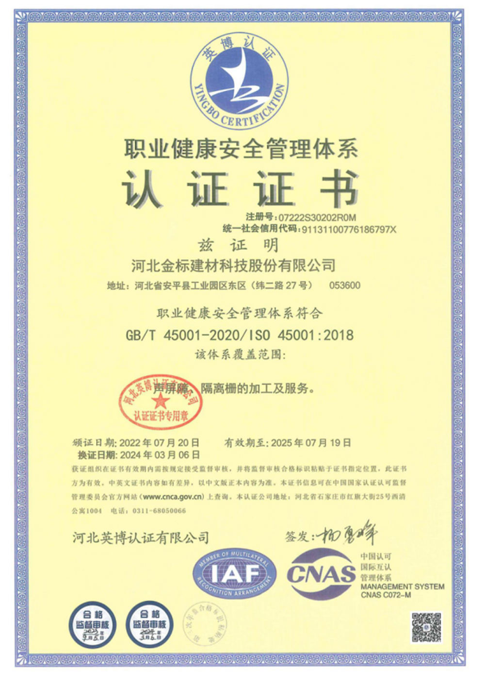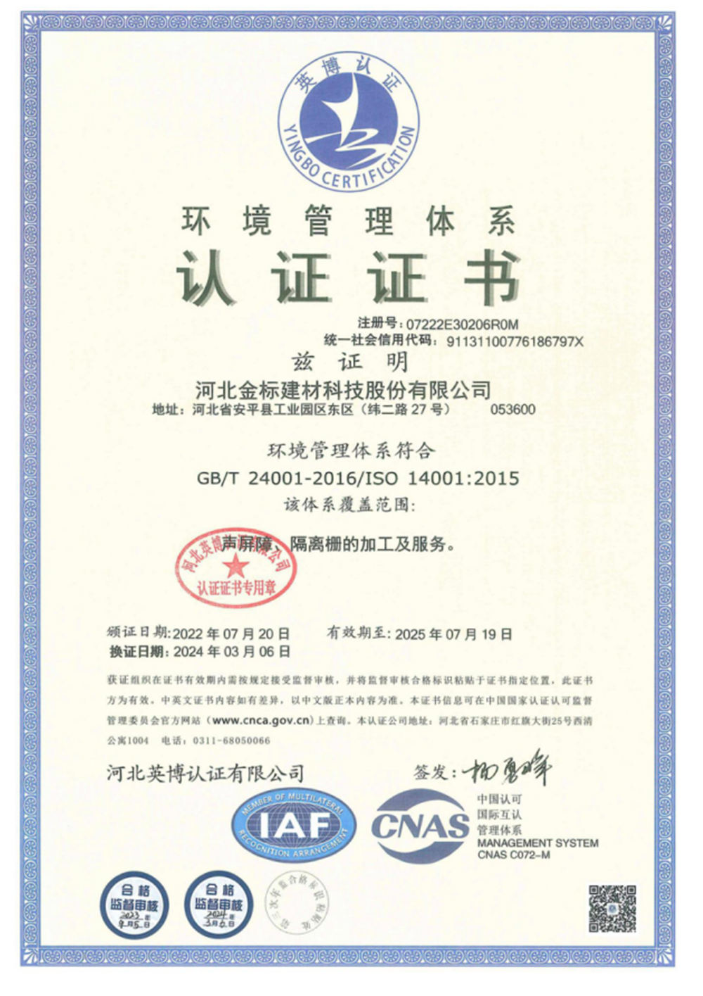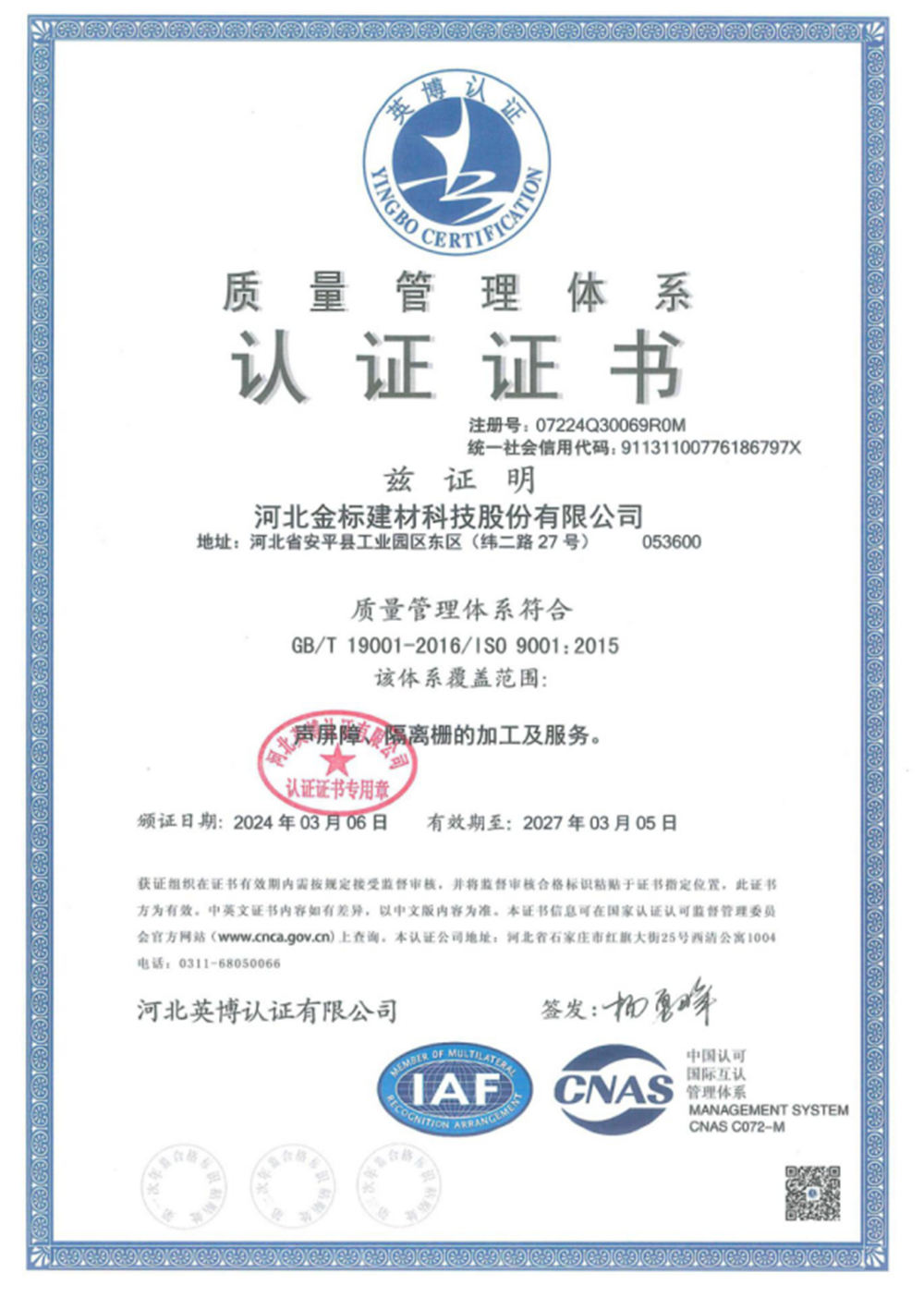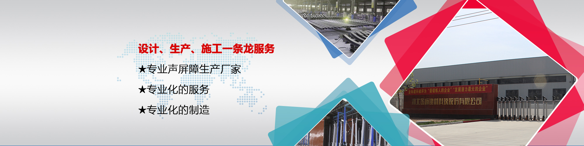 河北金標建材科技股份有限公司成立于2005年,1998年開始建廠生產,是一家國內較早從事交安材料的專業生產廠家之一;公司占地200萬畝,擁有員工400余名,注冊資金6040萬, 已通過ISO9001質量管理體系認證,具備產品批量生產合格證、多項檢測報告等,先后獲得“AAA級信用企業”、河北優秀企業”等殊榮。公司業務經營范圍包括高速公路、鐵路聲屏障生產基地;隔離柵,防護柵欄、刺鐵絲生產基地。